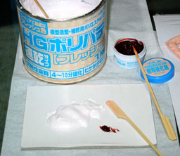 写真を見て頂けば解ると思いますが、ポリパテはペースト状の素材で、使う際には必要量をパレット等にとって硬化剤と混ぜて使用します。